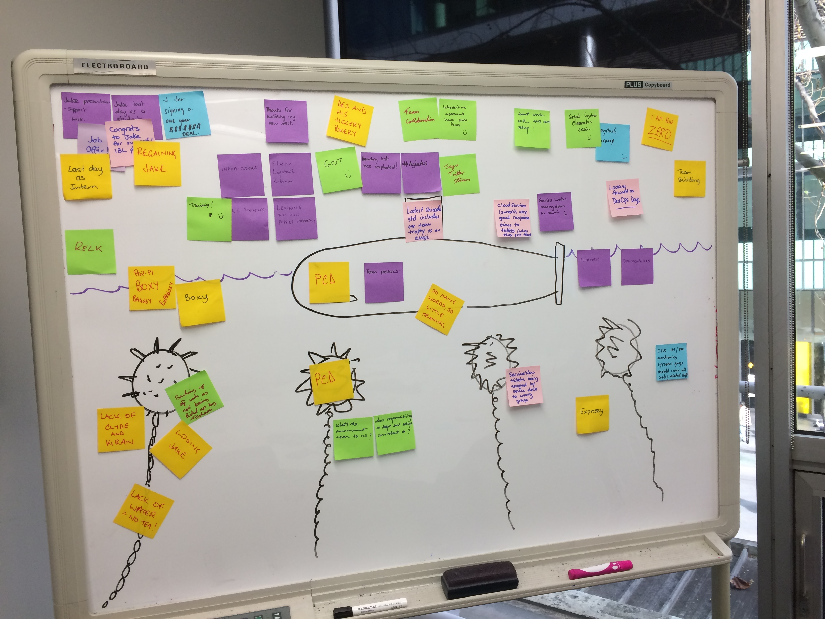 For the submarine retrospective we first drew a picture of the boat and placed it submerged in the water to represent the distinction between what is and isn’t working. We then drew some mines underneath to visualise that the submarine wasn’t in a position to dive as our focus area for what we could improve.
